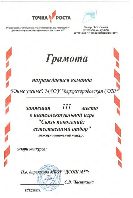 Обучающие Центра Точка роста приняли участие в межмуниципальном дистанционном конкурсе «Связь поколений: естественный отбор» . Участниками конкурса были не только дети, но и их родители. Для опытов было использовано оборудование Центра "Точка роста" нашей школы. Этапы конкурса: 1 этап. Приветствие, представление команд 2 этап. Блиц-игра. 3 этап. Самостоятельная работа команд, ответы на вопросы, опыты по биологии, физике и химии, оформление результатов. Наши "Юные ученые" заняли 3 место из 11 команд Пермского края.